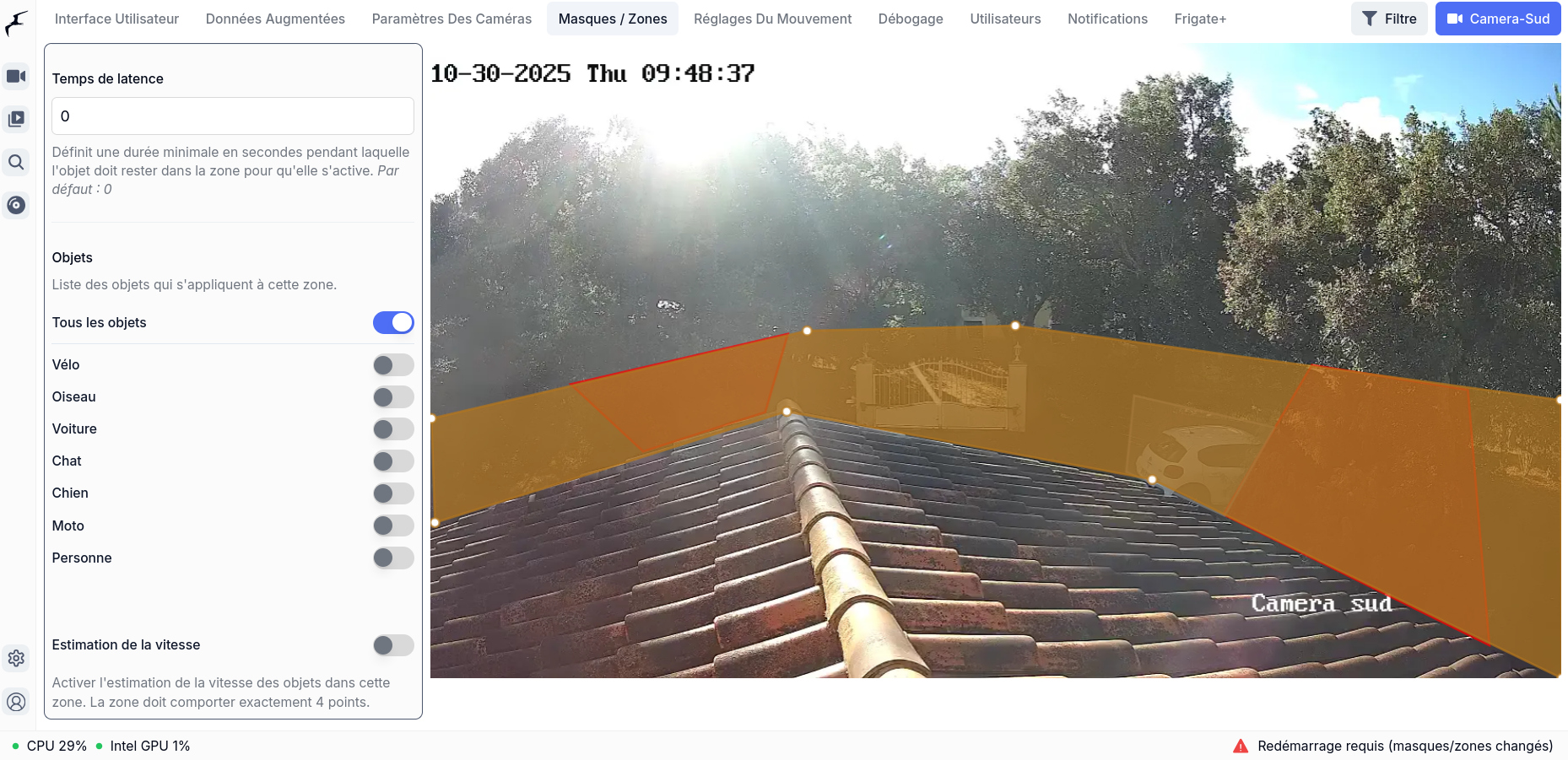 We start with the Masks/Zones tab. For each camera selectable from the blue button in the upper right corner, we define detection zones; other areas of the image will be ignored for detection.