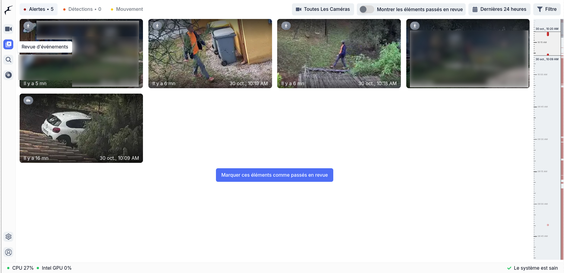 Clicking on the Event Review on the left displays all recent events (alerts, detections, movement). The detected object appears as an icon in the top left corner of the image; you can access the replay by clicking on the image. You can save the review by clicking on Mark these items as reviewed at the bottom.