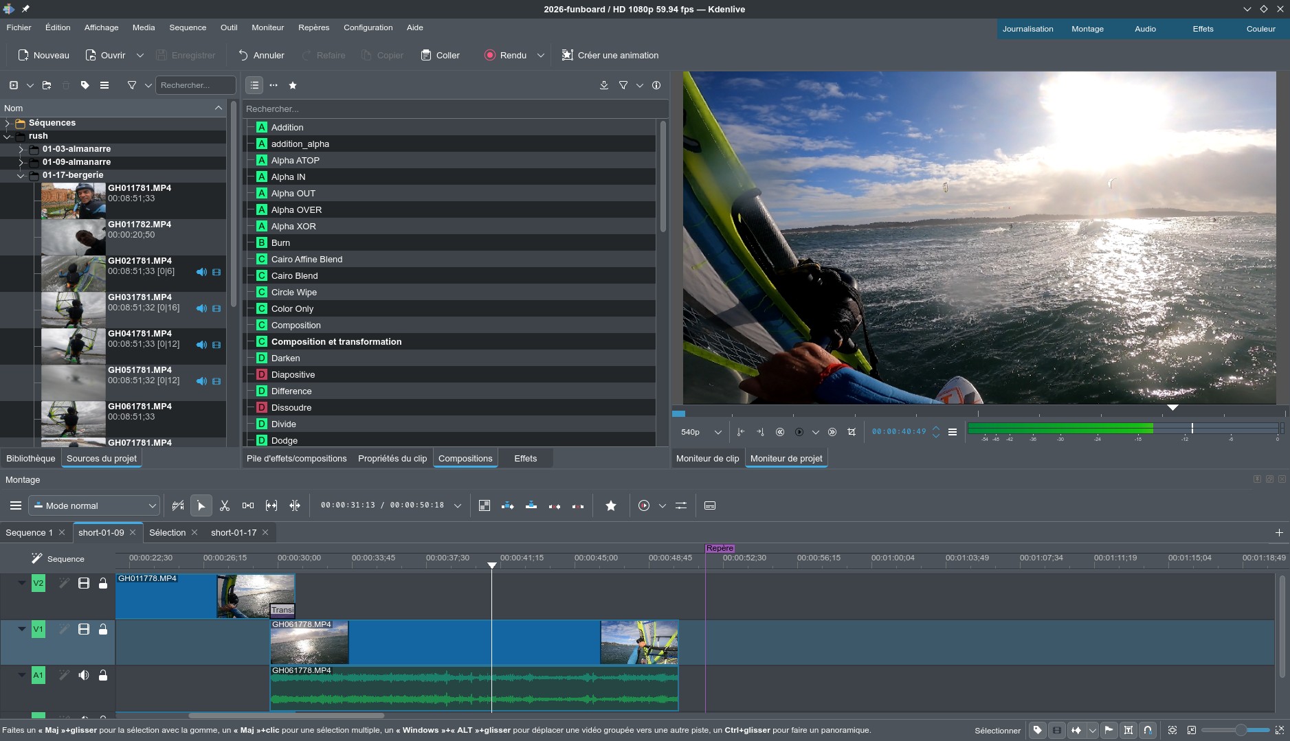 Kdenlive est certainement un des logiciels de montage les plus aboutis sous Linux, riche en fonctionnalité et qui permet milles fantaisies de montage mais qui du coup est assez complexe à utiliser, c'est le soft que j'utilise habituellement.